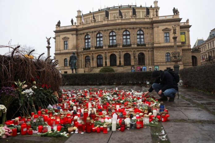 Εκατοντάδες άνθρωποι αφήνουν ένα λουλούδι στη μνήμη των θυμάτων του παρανοϊκού δολοφόνου που σκόρπισε τον θάνατο στο Πανεπιστήμιο του Καρόλου στο κέντρο της πόλης.