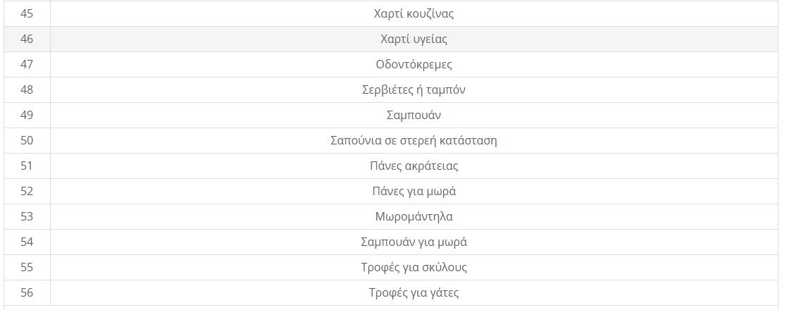 • απορρυπαντικά για σφουγγάρισμα και καθαρισμό επιφανειών – χλωρίνες, τροφές για σκύλους και τροφές για γάτες.