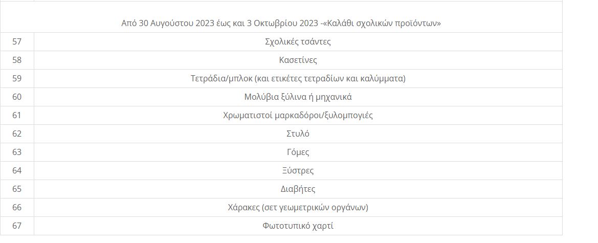 Στο καλάθι θα  συμπεριλαμβάνεται τουλάχιστον ένα προϊόν από τις εξής κατηγορίες: σχολικές τσάντες, κασετίνες, τετράδια (και ετικέτες τετραδίων και καλύμματα), μολύβια ξύλινα ή μηχανικά, μαρκαδόρους χρωματιστούς, στυλό, γόμες, ξύστρες, χάρακες, διαβήτες και φωτοτυπικό χαρτί.