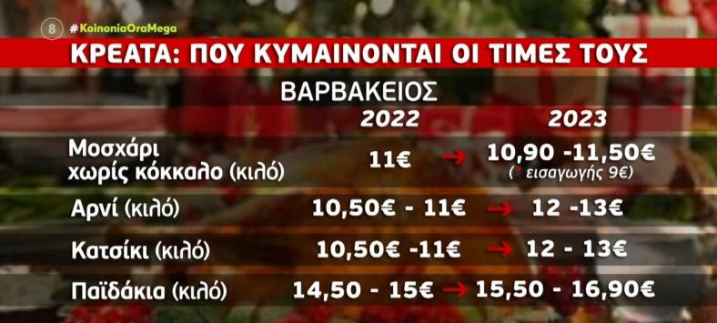 Στο «κόκκινο» παραμένει και η τιμή του κρέατος, καθώς πωλείται κατά 8,1% ακριβότερα από πέρσι.