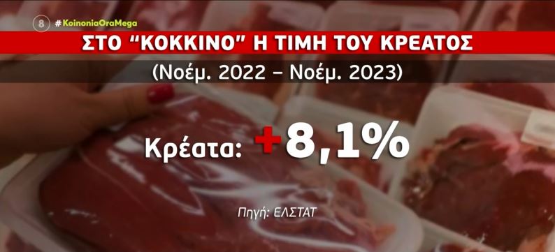 Στο «κόκκινο» παραμένει και η τιμή του κρέατος, καθώς πωλείται κατά 8,1% ακριβότερα από πέρσι.