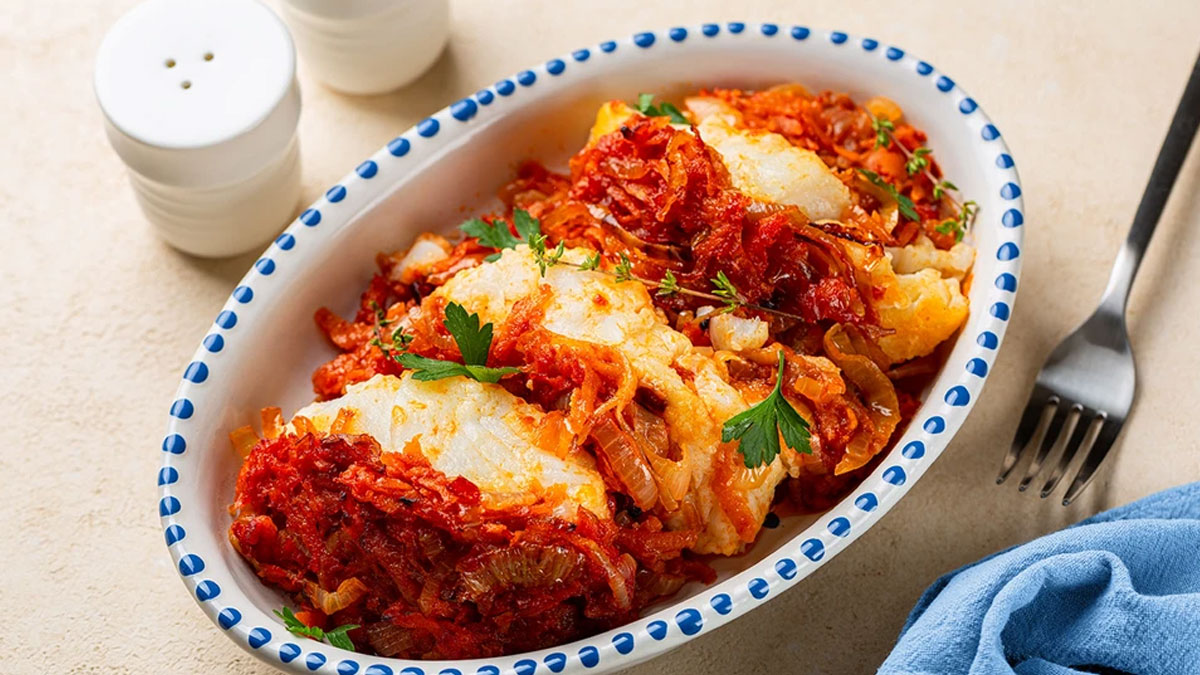 Ρίξτε σε ένα πυρέξ τη μισή σάλτσα, τοποθετήστε τον μπακαλιάρο και σκεπάστε ε την υπόλοιπη σάλτσα. Ρίξτε μέσα τις ελιές Καλαμών.