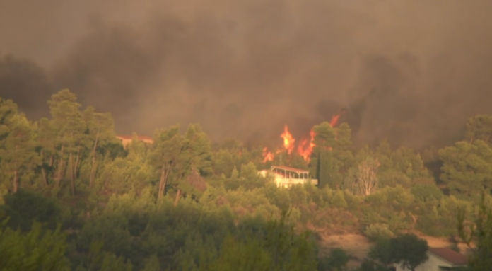 Το μέτωπο της φωτιάς χωρίστηκε στα δύο, με το ένα να κατευθύνεσαι προς Σταμάτα και το άλλο προς τη λίμνη Μαραθώνα.