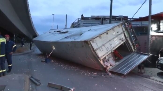Ο οδηγός του βαρέος οχήματος την ώρα που διέσχιζε την γέφυρα της Πέτρου Ράλλη, έχασε τον έλεγχο, με αποτέλεσμα να καταλήξει σε παράδρομο στην έξοδο της λεωφόρου Θηβών.