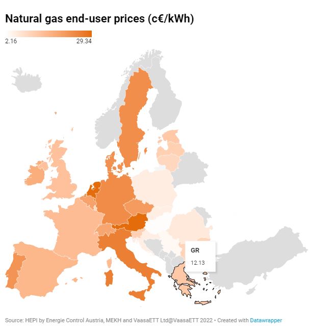 Στο φυσικό αέριο, το οικιακό τιμολόγιο στην Αθήνα διαμορφώνεται επίσης χαμηλότερα από τον μέσο όρο της ΕΕ (σσ. στα 13,33 σεντς, έναντι 15,09 στην Ευρώπη), ενώ σε σχέση με τον Νοέμβριο η τιμή στην Αθήνα αυξήθηκε κατά 10%.