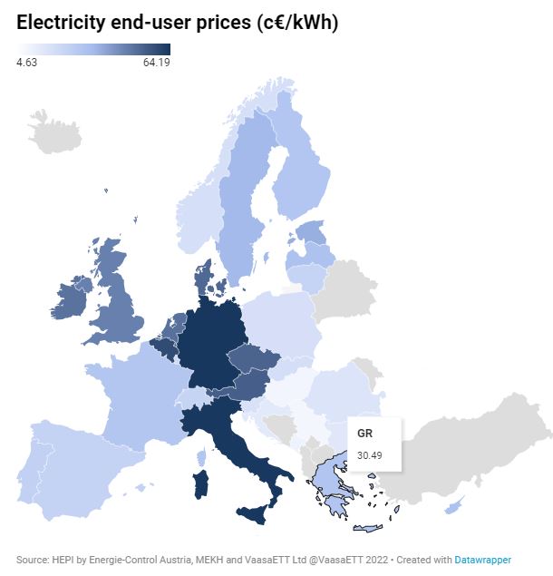 Πιο αναλυτικά, η τελική τιμή για τον καταναλωτή στην Ελλάδα τον Δεκέμβριο ανήλθε στα 30,33 σεντς ανά κιλοβατώρα, έναντι 31,74 σεντς που ήταν ο μέσος όρος της ΕΕ, τοποθετώντας την Αθήνα στην 15η θέση μεταξύ των «27» κρατών – μελών.