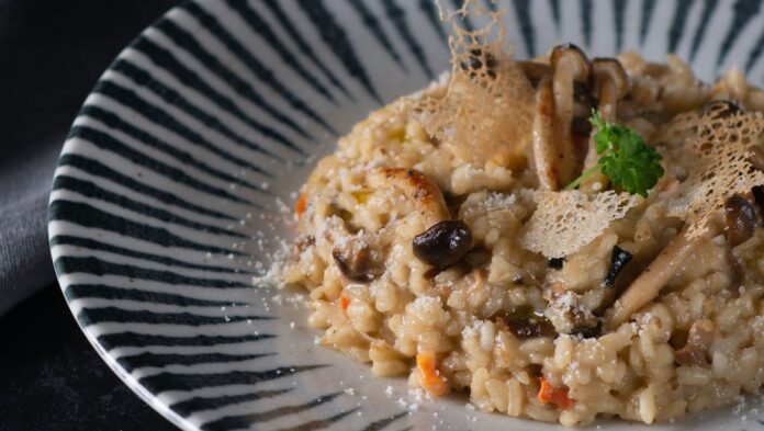 4. Στο τέλος κατεβάζετε το ριζότο από τη φωτιά, ρίχνετε την παρμεζάνα, ανακατεύετε και το σερβίρετε ζεστό.