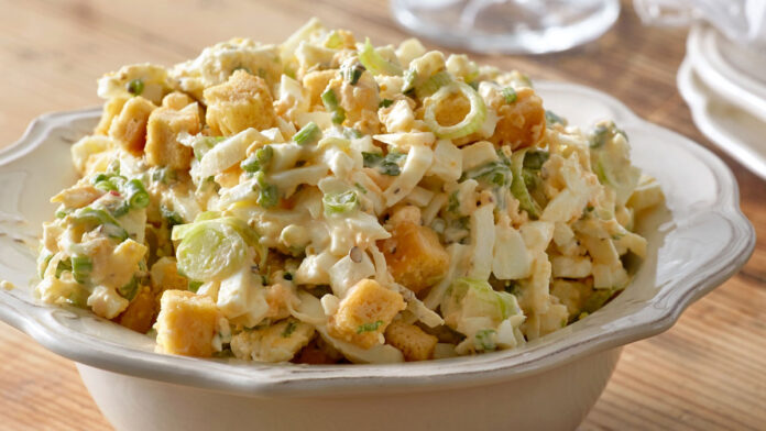 Μια δροσερή και χορταστική σαλάτα με βραστά αυγά, τραγανά λαχανικά και κρεμώδη μαγιονέζα, ιδανική για συνοδευτικό ή και ως ελαφρύ γεύμα. Συνδυάζει έντονη γεύση και φρεσκάδα, ενώ ετοιμάζεται εύκολα σε λίγα λεπτά.