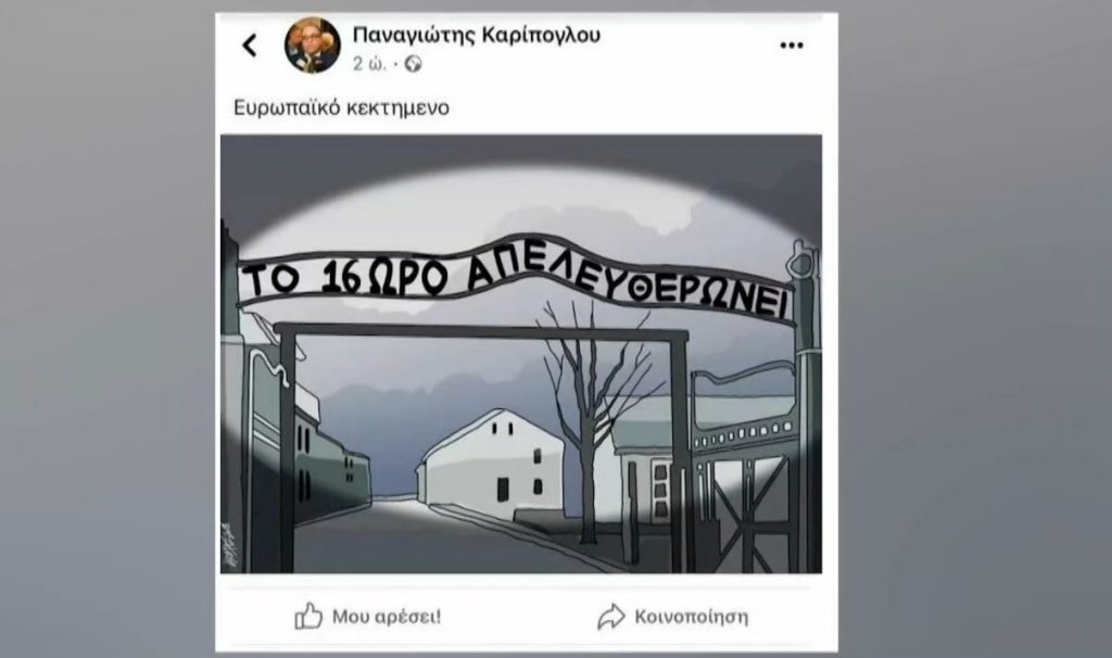 Ειδικότερα, στην ανάρτησή του στο προσωπικό του λογαριασμό Facebook, την οποία και «κατέβασε» μετά από τις αντιδράσεις που προκάλεσε, ο κ. Καρίπογλου παρουσιάζει ένα σκίτσο με την είσοδο του στρατοπέδου Άουσβιτς και την επιγραφή «το 16ωρο απελευθερώνει».
