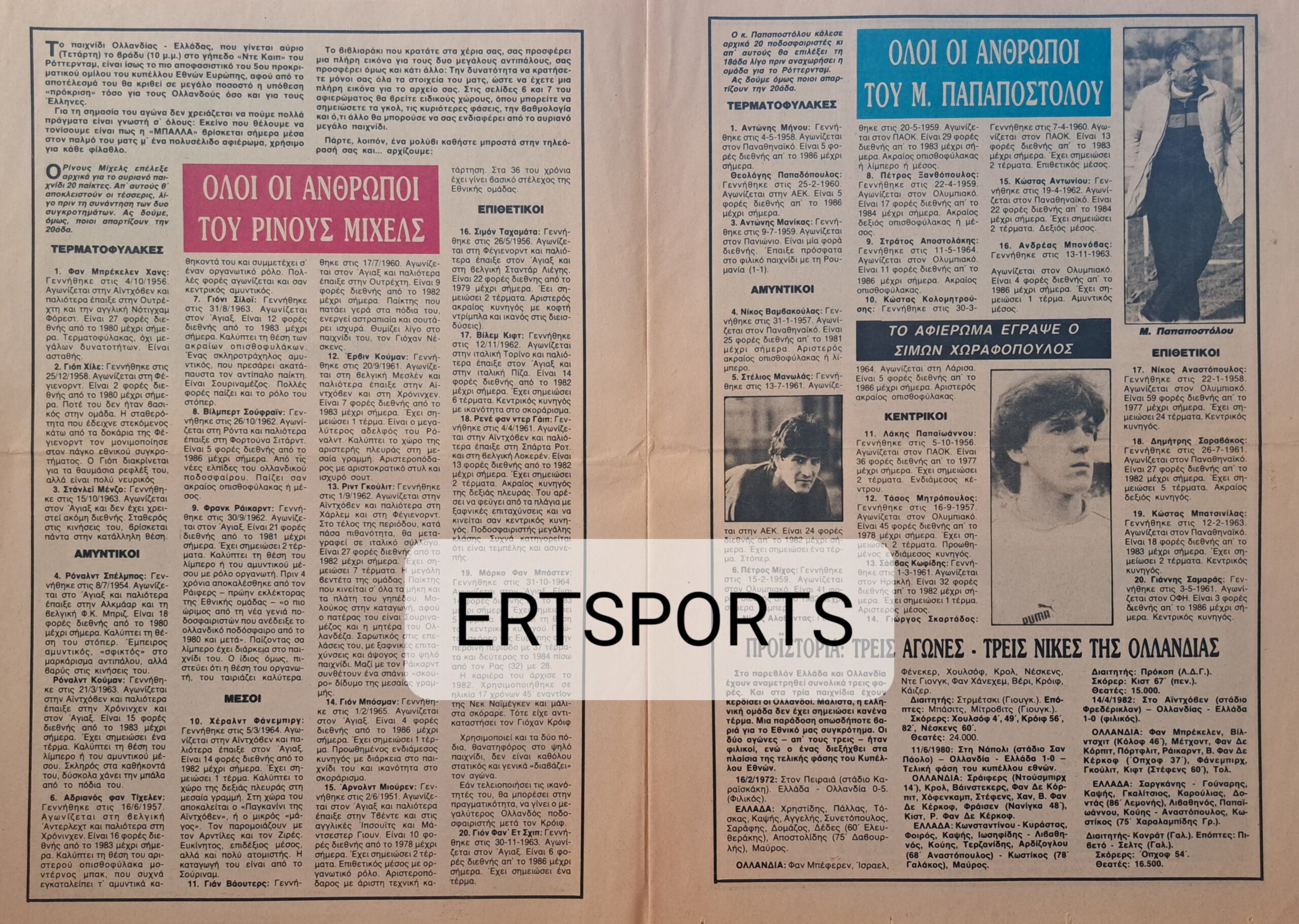 Η υπερομάδα του Ρίνους Μίχελς, αντιμετώπισε υπεροπτικά τους διεθνείς μας. Οι Ολλανδοί θεώρησαν ότι εύκολα θα πάρουν τη νίκη και θα εδραιωθούν στην κορυφή του ομίλου για την πρόκριση στην τελική φάση του EURO 1988. Υποχρεώθηκαν όμως πολύ νωρίς να αναθεωρήσουν, καθώς μόλις στο 6΄ έγινε το 0-1.