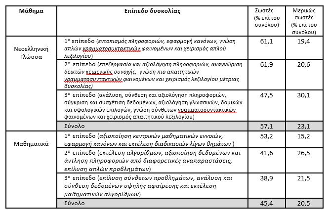 Σύμφωνα με όσα ανακοίνωσε το υπουργείου Παιδείαςγια τις επιδόσεις των μαθητών στα μαθήματα της Γλώσσας και των Μαθηματικών έδειξαν ότι: