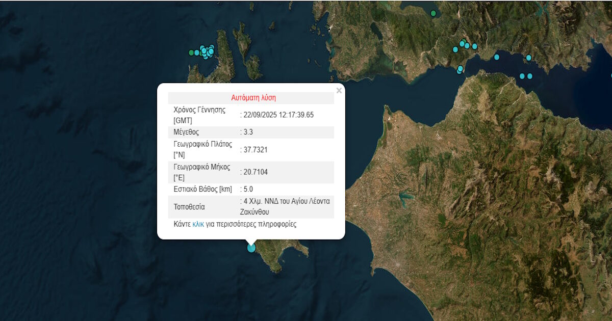 Σεισμός 3,3 Ρίχτερ εκδηλώθηκε σήμερα το μεσημέρι, Δευτέρα (22/9/2025), στη Ζάκυνθο, σύμφωνα με το Γεωδυναμικό Ινστιτούτο.
