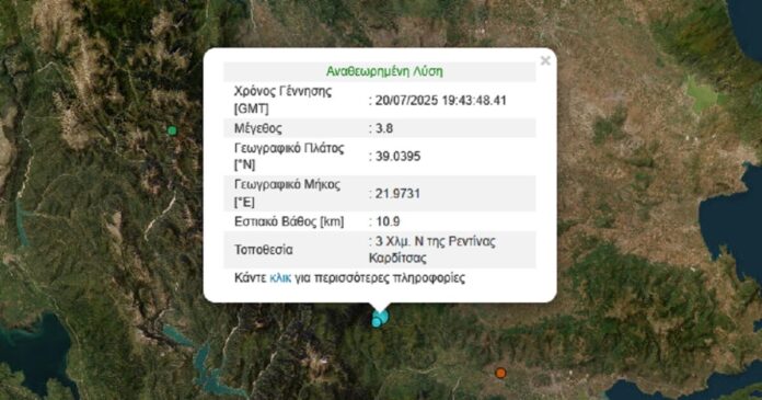 ΕλλάδαΣεισμός 3,8 Ρίχτερ στην Καρδίτσα σε χαμηλό εστιακό βάθος 20 Ιουλίου 2025FacebookTwitterPinterestWhatsApp Σεισμός 3,8 Ρίχτερ σημειώθηκε το βράδυ της Κυριακής (20/07/2025) στην Καρδίτσα και συγκεκριμένα τρία χιλιόμετρα νότια της Ρεντίνας.Ο σεισμός στην Καρδίτσα είχε εστιακό βάθος 10,9 χιλιόμετρα και έγινε αισθητός στην γύρω περιοχή. Περισσότερα σχόλιαΠηγή Παρόμοια άρθραΠερισσότερα απο τον δημιουργόΕπιθέσεις σκύλων: Τι φταίει πραγματικά και πώς μπορεί να προληφθούν τραγωδίες σαν της ΖακύνθουΧολαργός: Με δόλωμα μια κοπέλα έστησαν ραντεβού σε 14χρονο και τον μαχαίρωσανΜπλόκα αγροτών: Έκλεισε το αεροδρόμιο Ηρακλείου, μία πτήση ανά 3 ώρες στα Χανιά – Δύο συλλήψεις στο «Ν. Καζαντζάκης»