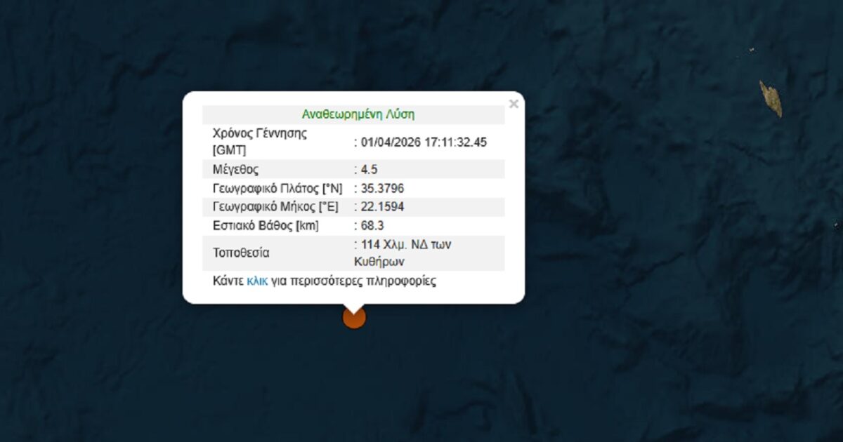Σεισμός μεγέθους 4,5 Ρίχτερ σημειώθηκε το απόγευμα της Τετάρτης (01/04/2026) σε θαλάσσια περιοχή ανοικτά της Κρήτης.