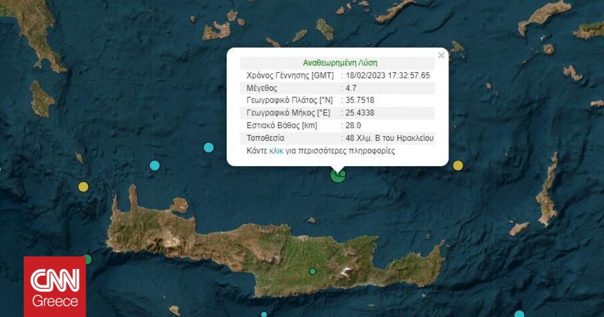 Σεισμική δόνηση μεγέθους 4,7 βαθμών της κλίμακας Ρίχτερ σημειώθηκε πριν από λίγο στην Κρήτη.