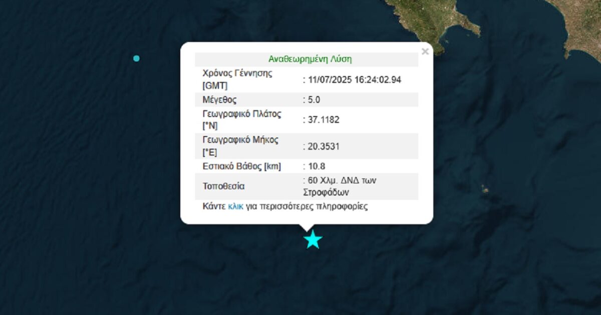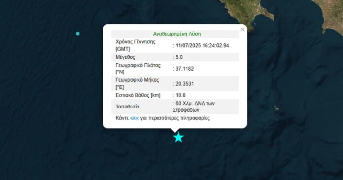Ισχυρός σεισμός 5 Ρίχτερ σημειώθηκε το απόγευμα της Παρασκευής (11/07/2025) ανοικτά των Στροφάδων σύμφωνα με το Γεωδυναμικό Ινστιτούτο.
