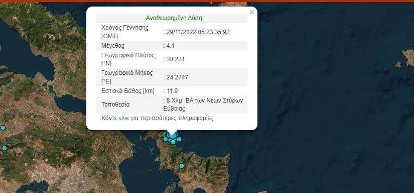 Πιο συγκεκριμένα, στις 7:23 σημειώθηκε δόνηση 4,1 Ρίχτερ σε απόσταση 56 χλμ. ανατολικά/βορειανατολικά των Αθηνών, σύμφωνα με το Γεωδυναμικό Ινστιτούτο, με το επίκεντρο της δόνησης εντοπίζεται στο θαλάσσιο χώρο 8 χλμ. βορειανατολικά των Νέων Στύρων Εύβοιας.