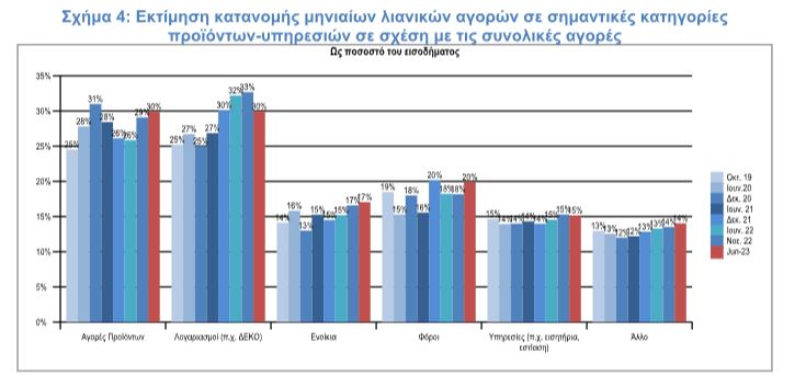 Σε σχέση με τις υπόλοιπες κατηγορίες δαπανών, καταγράφεται μια ελαφρώς αυξητική τάση, όμως οι δαπάνες για λογαριασμούς, ενοίκια και φόρους αντιπροσωπεύουν πλέον το 70% του συνολικού οικογενειακού εισοδήματος. Τα αποτελέσματα της έρευνας καταγράφουν ένα καταναλωτικό κοινό πιεσμένο, σε ένα μεταβατικό στάδιο, με βασική ανησυχία τις πληθωριστικές πιέσεις σε προϊόντα και ένα αρνητικό, αλλά βελτιούμενο καταναλωτικό κλίμα και στην αγορά της λιανικής στην Ελλάδα.