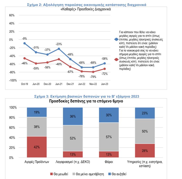 Ένας στους δύο καταναλωτές θα μειώσει τις δαπάνες για αγορά προϊόντων το επόμενο εξάμηνο, όπως αυτό προκύπτει από σχετική έρευνα που διενήργησε από τις 3 έως τις 5 Ιουνίου 2023 ο ΣΕΛΠΕ τα αποτελέσματα της οποίας βασίστηκαν στις απαντήσεις 900 πολιτών. Επίσης τα στοιχεία της έρευνας έδειξαν μεταξύ άλλων: