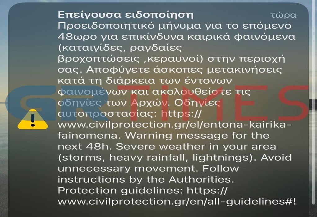 Παράλληλα, μήνυμα για την αποφυγή μετακινήσεων εστάλη από το 112 στα κινητά των πολιτών της Θεσσαλονίκης.