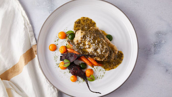 Σερβίρουμε στο πιάτο δύο κουταλιές πουρέ και το κρέας στο πλάι. Περιχύνουμε με το σούγο, ραντίζουμε με λίγο ελαιόλαδο και πασπαλίζουμε με ψιλοκομμένο μαϊντανό.