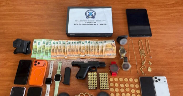 Μετά από έρευνα στις οικίες και στην κατοχή τους βρέθηκαν και κατασχέθηκαν χρηματικό ποσό των 1.600 ευρώ, σιδερογροθιά, πιστόλι και 99 φυσίγγια, 25 λίρες Αγγλίας, κοσμήματα, smartwatch, πλήθος τηλεφωνικών συνδέσεων και ρουχισμός που φορούσαν κατά την τέλεση των αξιόποινων πράξεων.