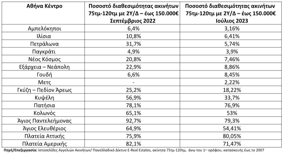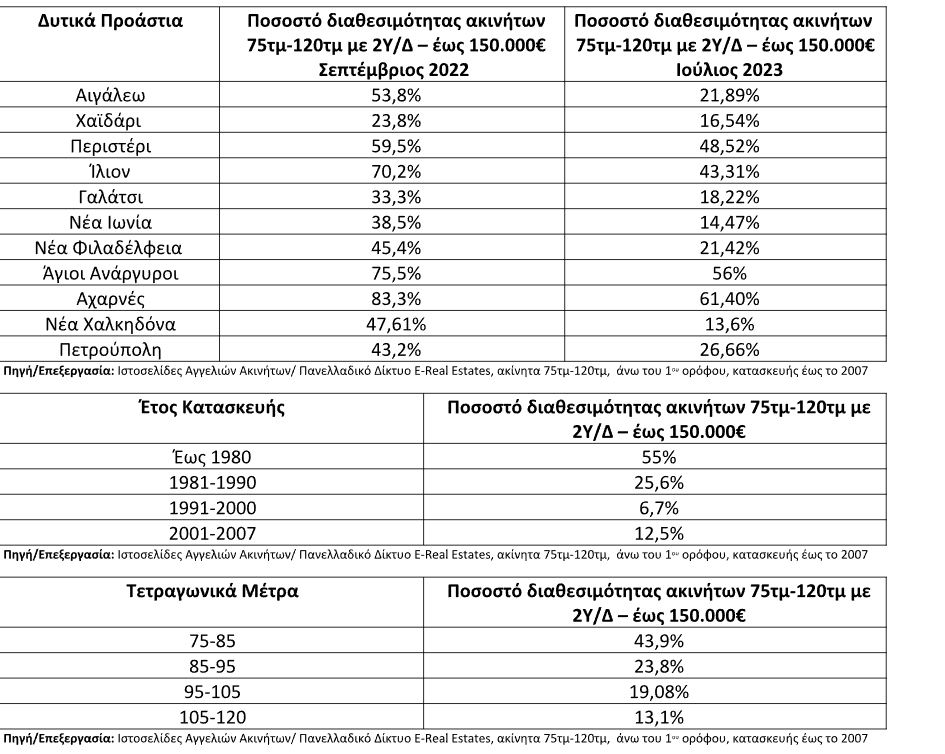 Σύμφωνα με τον κάτωθι πίνακα, η διαθεσιμότητα ακινήτων από 75τμ έως 120τμ άνω του 1 ου ορόφου, με έτος κατασκευής έως το 2007 και ζητούμενη τιμή έως 150.000€, καταγράφουν μείωση κατά 8,42 ποσοστιαίες μονάδες σε σχέση με τον Σεπτέμβριο του 2022, περιορίζοντας ακόμη περισσότερο την ήδη μικρή διαθεσιμότητα στις περιοχές του κέντρου της Αθήνας. Μεγαλύτερη μείωση καταγράφεται στις περιοχές των Δυτικών Προαστίων και του Πειραιά, 11,77 και 12,9 ποσοστιαίες μονάδες αντίστοιχα.