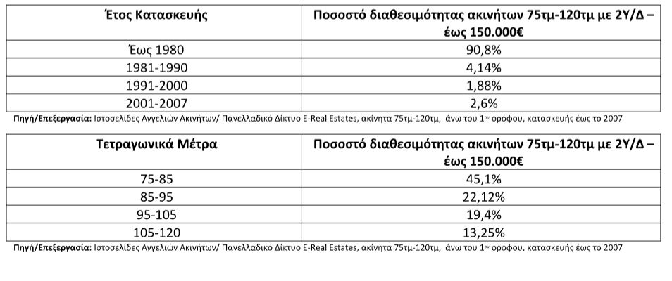 Τον Σεπτέμβριο του 2022, στις περιοχές του κέντρου των Αθηνών μόλις 3 στις 10 κατοικίες (36,6%), από 75τμ έως 120τμ ,άνω του 1 ου ορόφου, με 2Υ/Δ ,με έτος κατασκευής έως το 2007, διατίθενται προς πώληση με ζητούμενη τιμή έως 150.000€. Σήμερα, λιγότερο από 3 στις 10 κατοικίες. Εφόσον ο ενδιαφερόμενος βρει την κατοικία που πληροί τις προδιαγραφές του προγράμματος, θα πρέπει να γνωρίζει ότι το 90,8% των διαθέσιμων κατοικιών είναι κατασκευής έως το 1980 – δηλαδή τουλάχιστον 43ετών σπίτια. Ενώ παράλληλα, το 67,22% των διαθέσιμων κατοικιών είναι επιφάνειας από 75τμ έως 95τμ σύμφωνα με τον κάτωθι πίνακα.