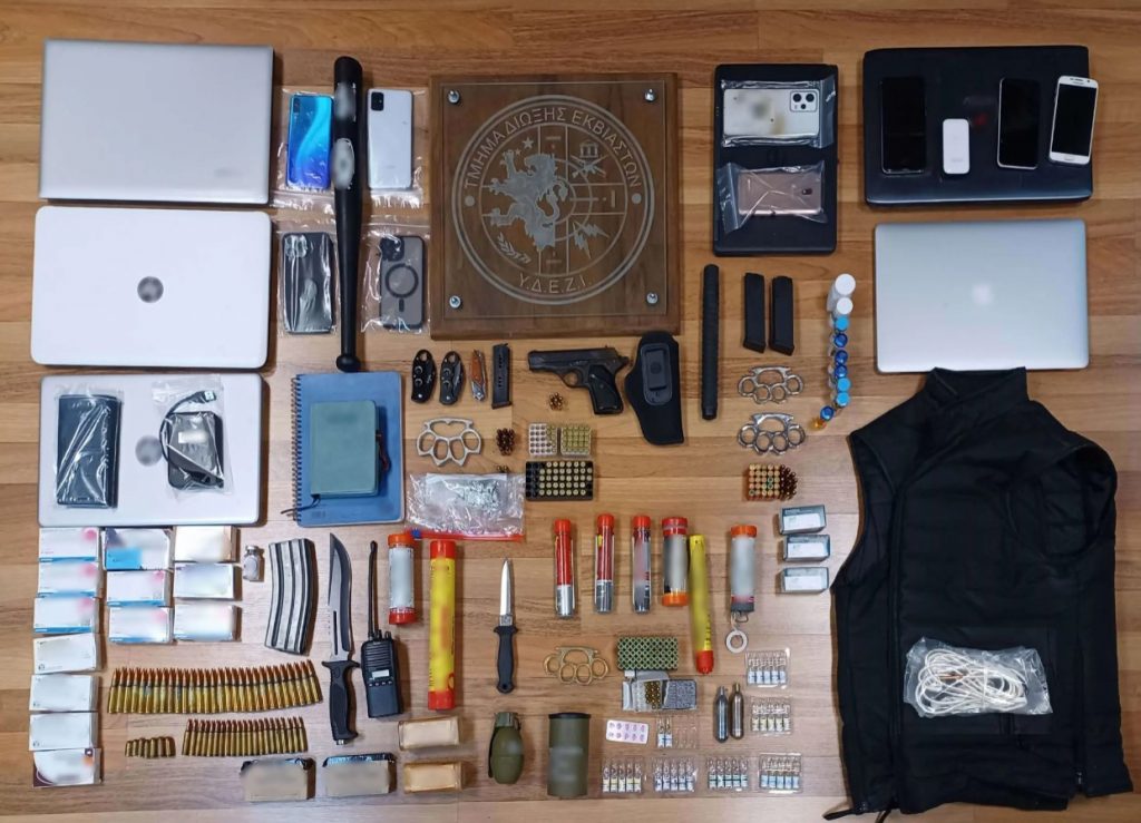 Στην κατοχή των συλληφθέντων βρέθηκαν σφαίρες, πιστόλια, βραδύκαυστα φυτίλια, δύο κουτιά σημαντικής ποσότητας εκρηκτικής ύλης, χειροβομβίδες αλλά και φωτοβολίδες.