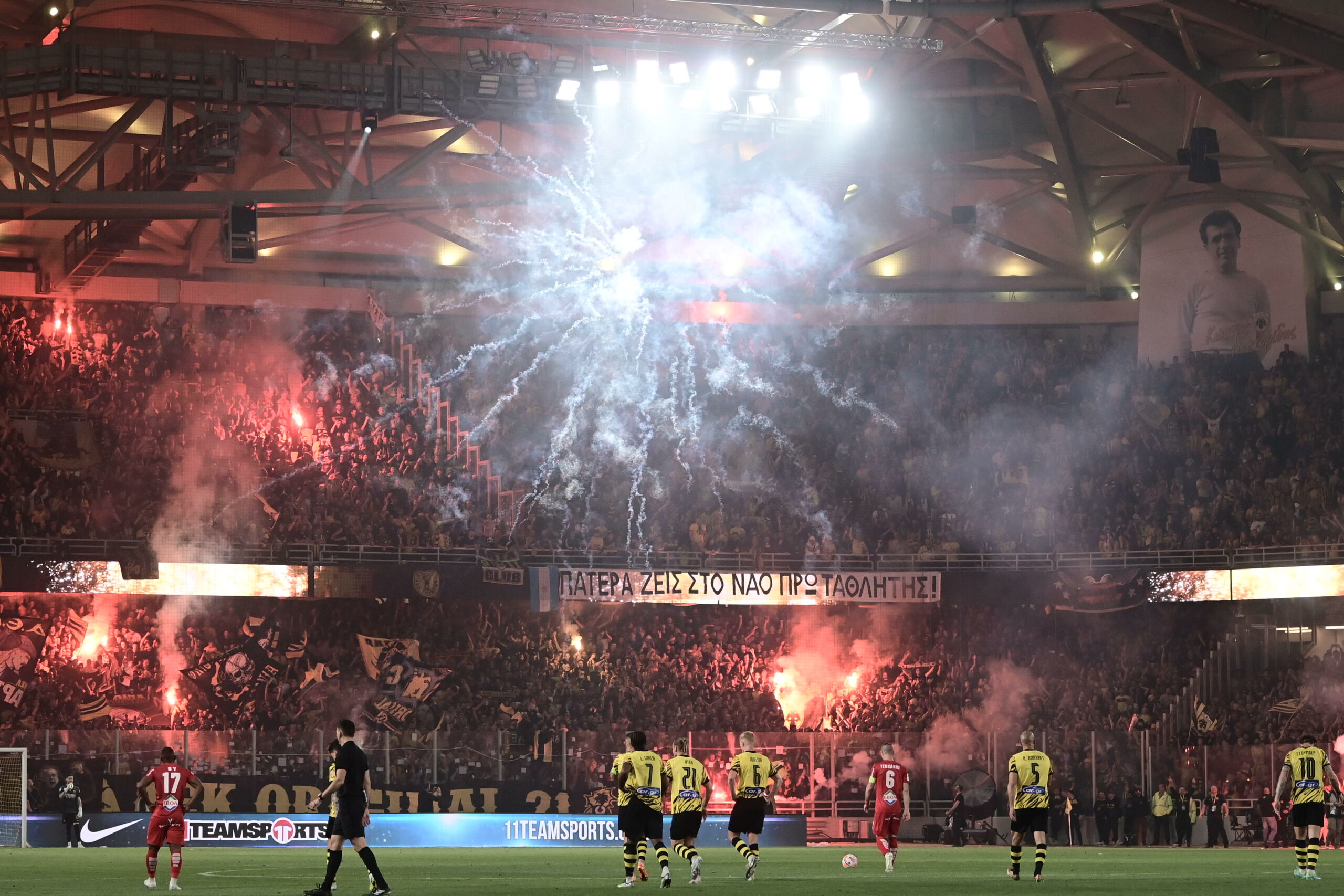 Πρωταθλήτρια Ελλάδος μετά από 5 χρόνια η ΑΕΚ. Η ομάδα του Ματίας Αλμέιδα, επικράτησε του Βόλου με 4:0 και έκοψε πρώτη το νήμα της Super League. 32.000 φίλοι της ομάδας που βρέθηκαν στην “OPAP Arena” και χιλιάδες άλλοι απ’ έξω δημιούργησαν μία εξαιρετική ατμόσφαιρα με το γήπεδο να παίρνει… φωτιά!