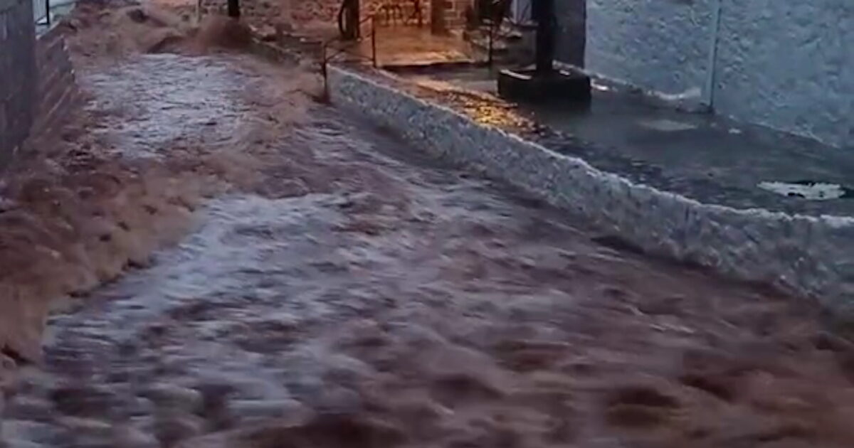 Ένα βίντεο που κυκλοφορεί στα social media δείχνει έναν ορμητικό χείμαρρο να «κόβει» στη μέση κεντρικό δρόμο του νησιού, αναδεικνύοντας τη δύναμη των φαινομένων.