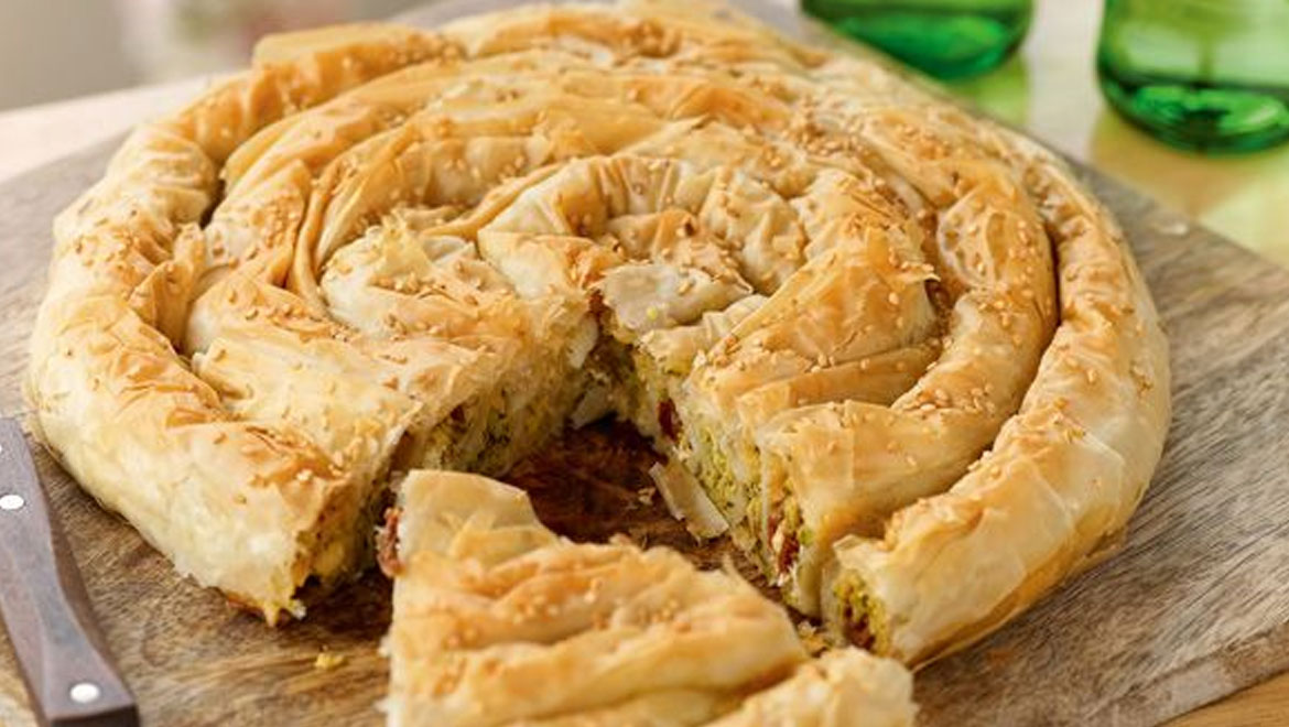 Ραντίζουμε την πίτα με ελαιόλαδο και λίγες σταγόνες νερό. Ψήνουμε σε αντιστάσεις, στην κάτω σχάρα, για περίπου 50 λεπτά. Είναι έτοιμη όταν ροδίσει ομοιόμορφα και ξεκολλάει εύκολα από το ταψί.
