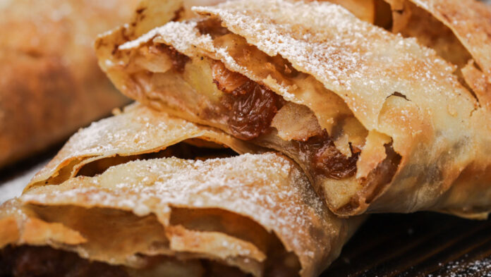 Αφήνουμε το στρούντελ να κρυώσει ελαφρώς, πασπαλίζουμε με άχνη ζάχαρη και λίγη κανέλα, κόβουμε σε κομμάτια και απολαμβάνουμε!