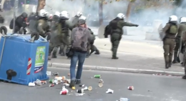 Είναι η στιγμή που στην κάτω πλευρά της πλατείας Συντάγματος ξεκινούν επεισόδιά μεταξύ κουκουλοφόρων και αστυνομικών δυνάμεων.