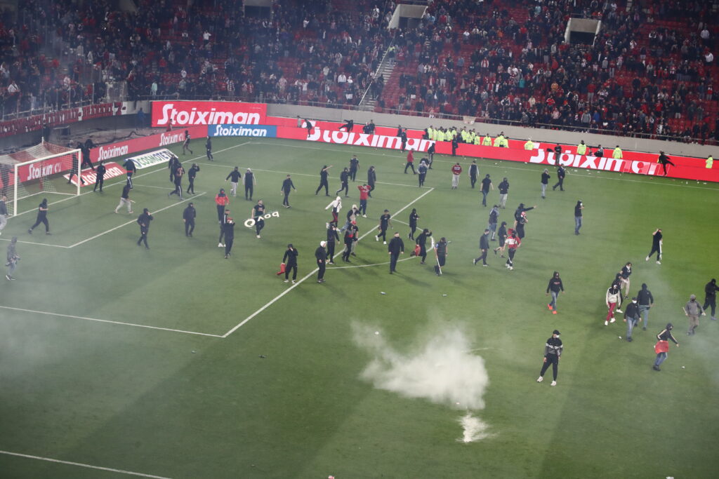 Μεγάλη ένταση και επεισόδια εντός αγωνιστικού χώρου με τη λήξη του παιχνιδιού ανάμεσα σε Ολυμπιακό και ΑΕΚ, δημιουργήθηκε μεταξύ οπαδών των “ερυθρόλευκων” και δυνάμεις της αστυνομίας.