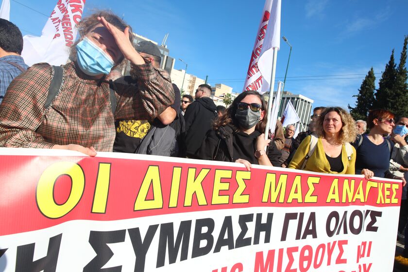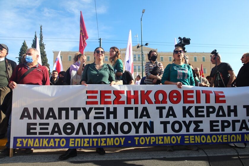 «Κλιμακώνουμε την πάλη μας για Συλλογικές Συμβάσεις, αυξήσεις στους μισθούς. Ενάντια στην ακρίβεια και τους πλειστηριασμούς» ήταν το σύνθημα που δέσποζε στο μαζικό συλλαλητήριο στην πλατεία Συντάγματος.