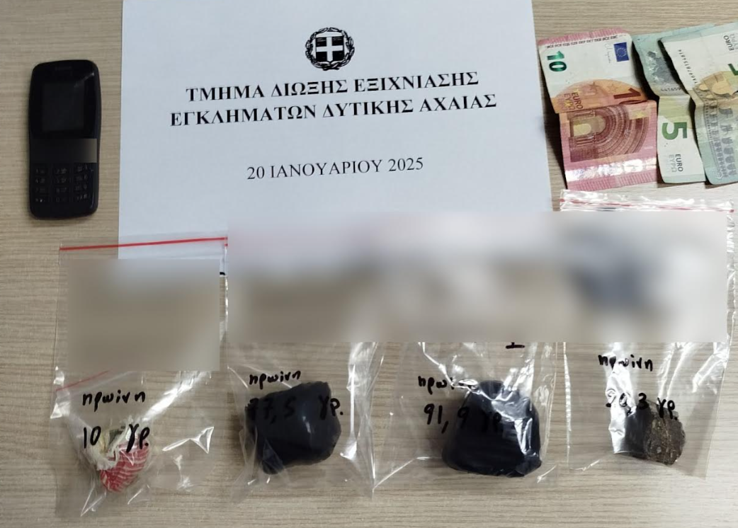 Ειδικότερα, οι αστυνομικοί του Τμήματος Δίωξης και Εξιχνίασης Εγκλημάτων Δυτικής Αχαΐας, αξιοποιώντας πληροφορίες, εντόπισαν τον κατηγορούμενο, έξω από την οικία του και σε αστυνομικό έλεγχο, που του ενήργησαν, βρήκαν στην κατοχή του και κατέσχεσαν -199,7- γραμμάρια ηρωίνης, -1- κινητό τηλέφωνο και το χρηματικό ποσό των -20- ευρώ.