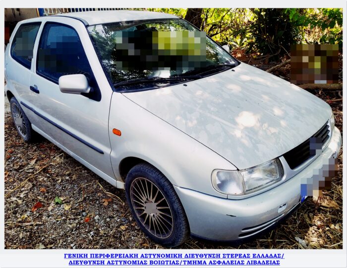 Επιπλέον, οι αστυνομικοί κατάσχεσαν από εγκαταλειμμένη αποθήκη, ευρύτερης περιοχής του Ορχομενού, το προαναφερόμενο κλεμμένο Ι.Χ.Ε. αυτοκίνητο και εντός αυτού, διάφορα εργαλεία και μία δερμάτινη τσάντα με έγγραφα (ως προϊόντα κλοπής), τα οποία ο συλληφθείς είχε κρύψει στον ανωτέρω χώρο, καθώς και ένα κινητό τηλέφωνο από την κατοχή του.