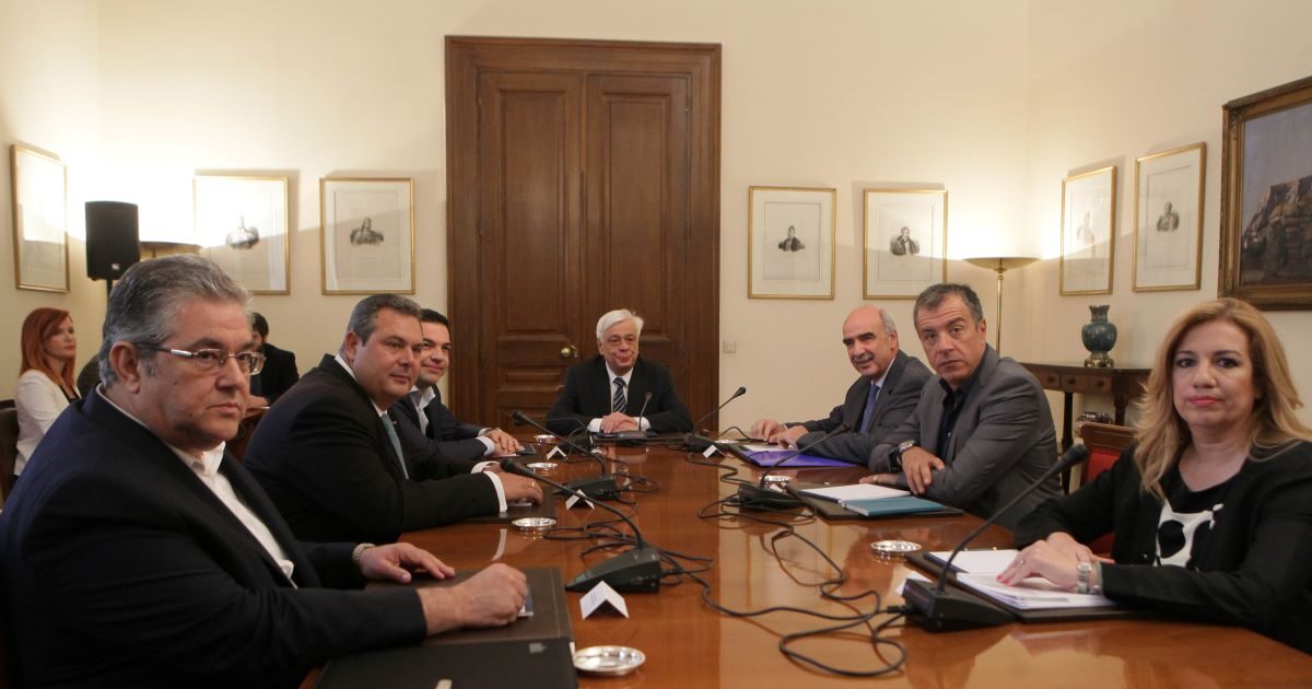 Στο συμβούλιο των πολιτικών αρχηγών συμμετείχαν εκτός από τον τότε Πρόεδρο της Δημοκρατίας και τον τότε πρωθυπουργό, ο αρχηγός της αξιωματικής αντιπολίτευσης και τότε μεταβατικός πρόεδρος της ΝΔ, Βαγγέλης Μεϊμαράκης, η αείμνηστη πρόεδρος του ΠΑΣΟΚ, Φώφη Γεννηματά, ο γενικός γραμματέας του ΚΚΕ, Δημήτρης Κουτσούμπας, ο επικεφαλής του Ποταμιού, Σταύρος Θεοδωράκης και ο πρόεδρος των Ανεξάρτητων Ελλήνων και τότε υπουργός Εθνικής Άμυνας, Πάνος Καμμένος.