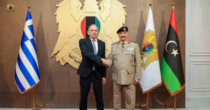 Ο Υπουργός Εξωτερικών, Γιώργος Γεραπετρίτης, κατά την επίσκεψή του στη Βεγγάζη, πραγματοποίησε συναντήσεις με τον επικεφαλής του Λιβυκού Εθνικού Στρατού, Στρατάρχη Khalifa Haftar, και τον Α/ΓΕΕΘΑ του Λιβυκού Εθνικού Στρατού, Στρατηγό Khaled Khalifa Haftar. pic.twitter.com/lx95vIFeQu