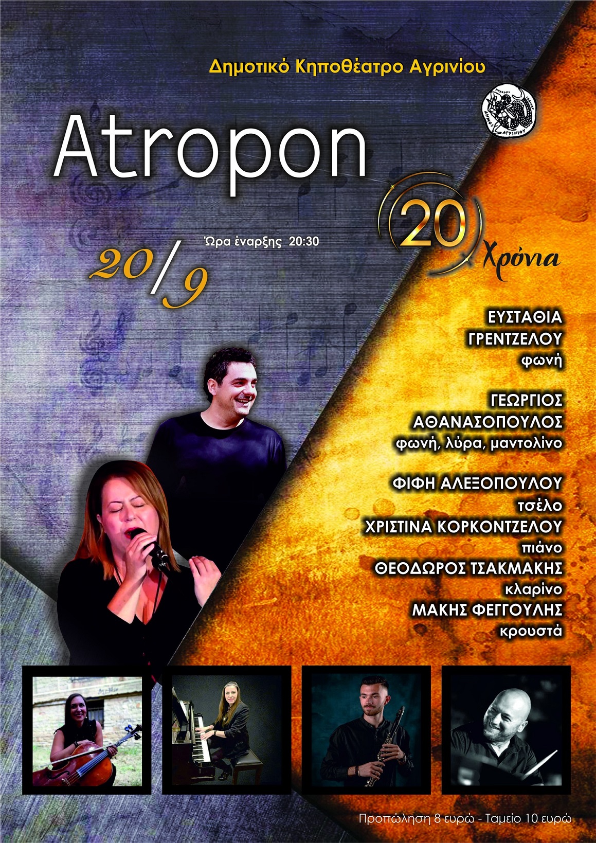 Το συγκρότημα ATROPON γιορτάζει τα 20 χρόνια από την δημιουργία του, με μια συναυλία στο Δημοτικό Κηποθέατρο Αγρινίου (Πάρκο) το Σάββατο 20 Σεπτεμβρίου 2025 στις 20:30 μ.μ.