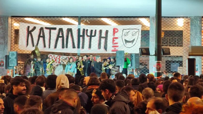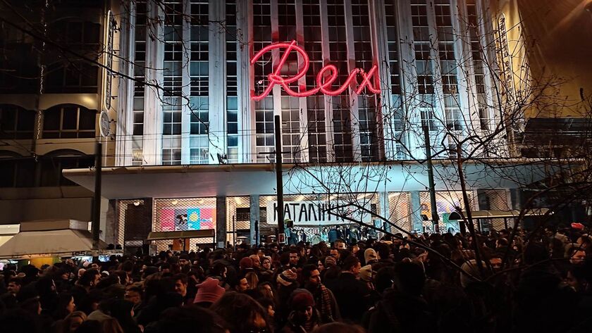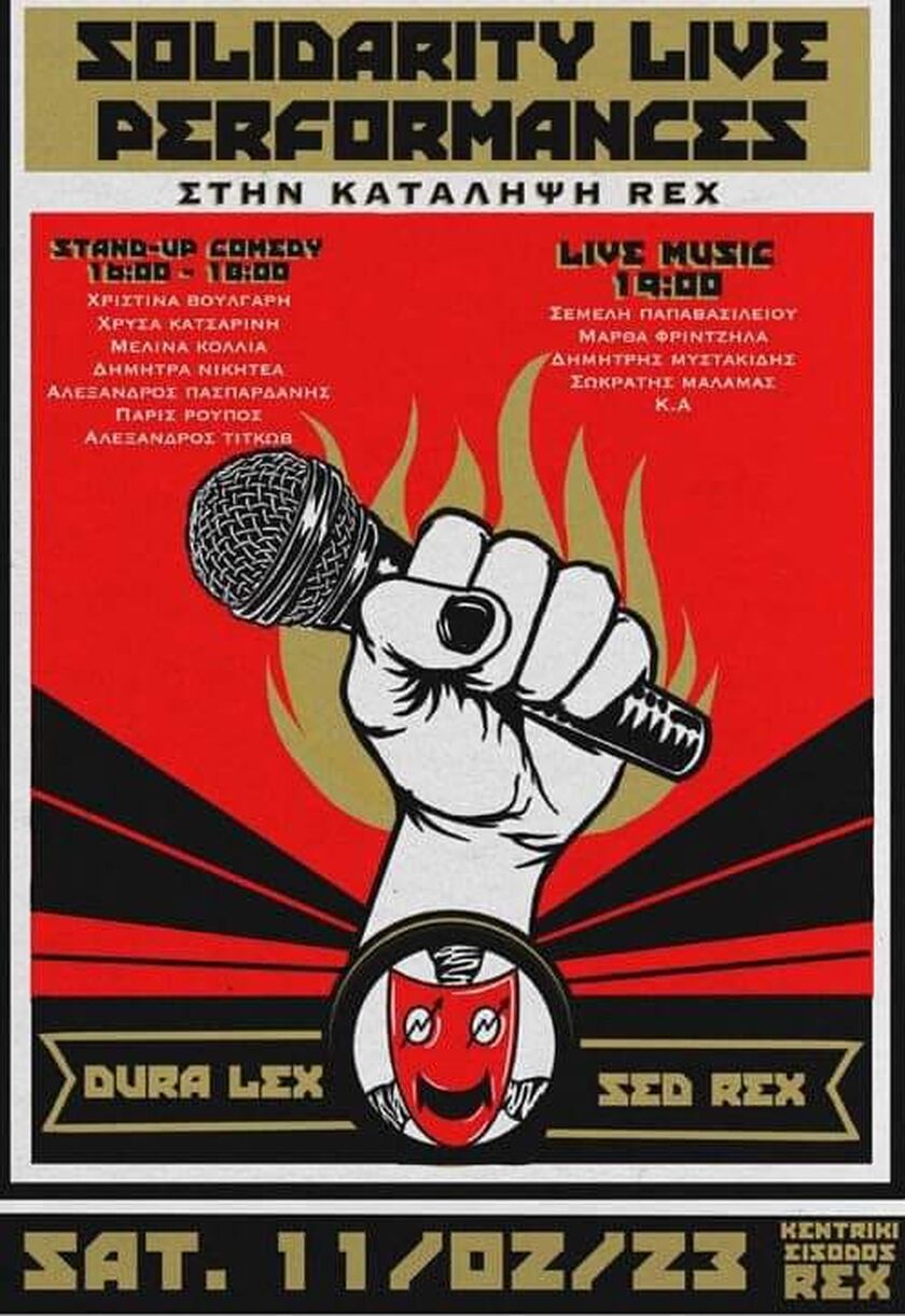 Το ραντεβού των καλλιτεχνών και πλήθους κόσμου το βράδυ του Σαββάτου, δόθηκε έξω από το κατειλημμένο REX, στην Πανεπιστημίου ως συνέχεια της συναυλίας αλληλεγγύης μπροστά από το κτίριο του Εθνικού Θεάτρου στην οδό Αγίου Κωνσταντίνου.