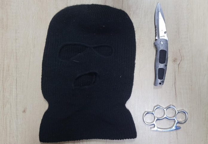 Ειδικότερα, όπως προέκυψε από την αστυνομική έρευνα, στην κατοχή του κατηγορουμένου βρέθηκαν και κατασχέθηκαν αναδιπλούμενος σουγιάς, σιδερογροθιά, καθώς και κουκούλα τύπου “full face” σε απόκρυφο σημείο του σώματός του.