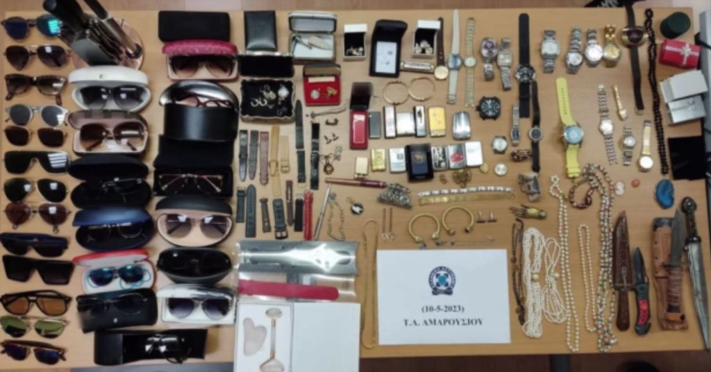 Η Αστυνομία εντόπισε χθες την 46χρονη στο σπίτι της, εντός του οποίου βρισκόταν και ο 27χρονος, και μετά από έρευνα που βρέθηκαν μεταξύ άλλων και κατασχέθηκαν: 2 αυτοσχέδιες συσκευασίες που περιείχαν ναρκωτική ουσία (πιθανόν ινδική κάνναβη) συνολικού βάρους 3,6 γραμμ., αεροβόλο πιστόλι, 4 μαχαίρια, 2 ποδήλατα, πλήθος ρολογιών χειρός, πλήθος γυαλιών ηλίου, κοσμήματα, αναπτήρες, είδη ρουχισμού και τσάντες. Επίσης βρέθηκε μέρος των αφαιρεθέντων από το σπίτι στο Μαρούσι και αποδόθηκαν στο νόμιμο ιδιοκτήτη.