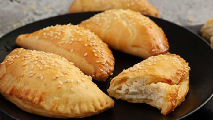 Παίρνεις μικρές ποσότητες ζύμης, τις ανοίγεις με το χέρι σε στρογγυλά δισκάκια και βάζεις μια κουταλιά γέμισης στο κέντρο. Διπλώνεις στη μέση σχηματίζοντας μισοφέγγαρα και κλείνεις καλά τις άκρες με πιρούνι.