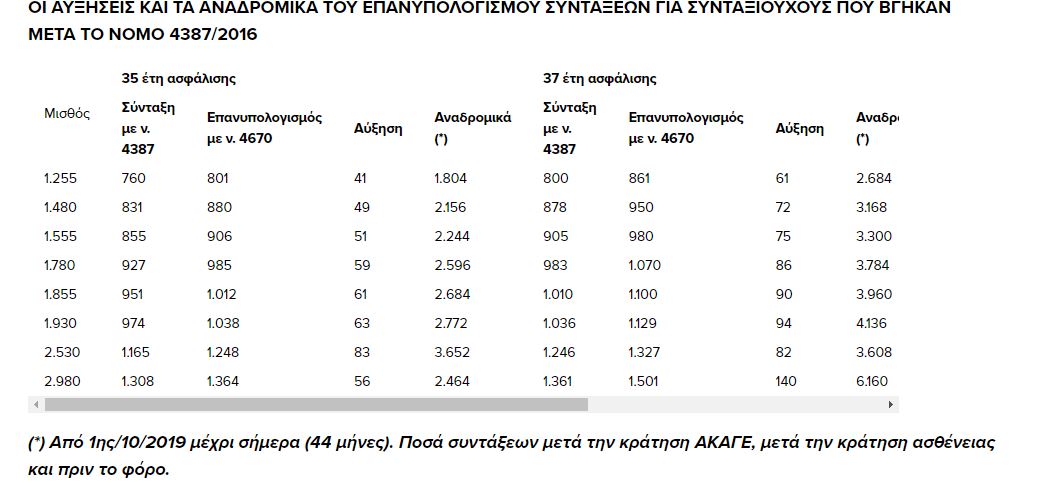 Σύμφωνα με τον πίνακα που δημοσιεύει ο «Ελεύθερος Τύπος», οι αυξήσεις και τα αναδρομικά του επανυπολογισμού που έρχονται για τους συνταξιούχους έχουν ως εξής: