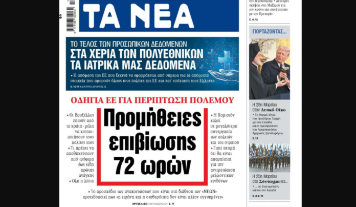 Σύμφωνα με το πρωτοσέλιδο της εφημερίδας «Τα Νέα», οι Βρυξέλλες ζητούν από τα κράτη – μέλη να κινητοποιήσουν τους πολίτες τους και να αποθηκεύσουν από τρόφιμα έως είδη πρώτης ανάγκης.