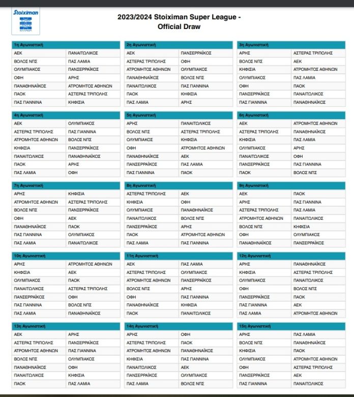 Ολοκληρώθηκε η κλήρωση του πρωταθλήματος στα γραφεία της Super League. Χωρίς ντέρμπι η πρεμιέρα και με εντός έδρας αναμετρήσεις για ΑΕΚ, Παναθηναϊκό, Ολυμπιακό και ΠΑΟΚ. Στην Κρήτη κόντρα στον ΟΦΗ ο Άρης.