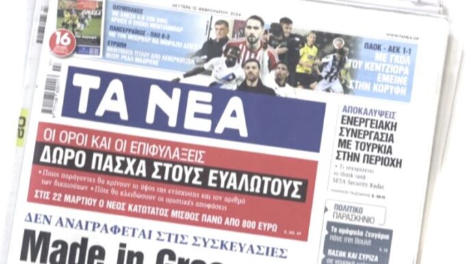 ΕλλάδαΤα πρωτοσέλιδα των εφημερίδων σήμερα 12 Φεβρουαρίου 2024FacebookTwitterPinterestWhatsApp Πηγή Παρόμοια άρθραΠερισσότερα απο τον δημιουργόΑγρότες: Κλειστό το αεροδρόμιο Χανιών λόγω των κινητοποιήσεων – Μέχρι τις 11 το βράδυ οι πτήσεις στο «Ν. Καζαντζάκης» στο ΗράκλειοΜυτιλήνη: Αγρότες εμπόδισαν τους επιβάτες να μπουν στο πλοίο «Διαγόρας» – Αναχώρησε από το λιμάνι άδειοΑγρότες: Ταυτοποιήθηκαν όσοι συμμετείχαν στα επεισόδια σε Ηράκλειο και Χανιά – Αντιμετωπίζουν βαριές κατηγορίες