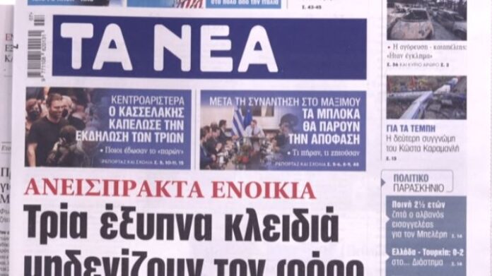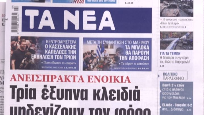 ΕλλάδαΤα πρωτοσέλιδα των εφημερίδων σήμερα 14 Φεβρουαρίου 2024FacebookTwitterPinterestWhatsApp Πηγή Παρόμοια άρθραΠερισσότερα απο τον δημιουργόΣυναγερμός στα Καλύβια: Βρέθηκε ύποπτο αντικείμενο κάτω από αυτοκίνητοΑγρότες: Κλιμακώνουν τα μπλόκα σε όλη την Ελλάδα – Οι δρόμοι και οι παρακαμπτήριοι που είναι κλειστοίΗ Τουρκία προκαλεί ξανά με τρεις παραβάσεις του FIR Αθηνών στο νοτιοανατολικό Αιγαίο
